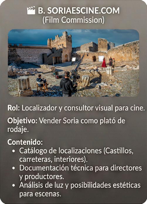 Gestor del sitio web www.soriaescine.com ,donde publica documentales, fotos y visitas virtuales de espacios naturales y monumentos de la provincia de Soria para la Film Commission.