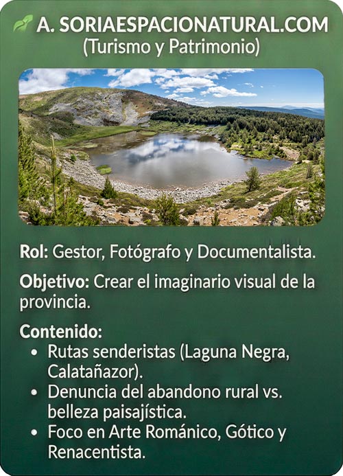 Gestor del sitio web www.soriaespacionatural.com ,donde publica rutas, fotos y visitas virtuales de espacios naturales y monumentos de la provincia de Soria.